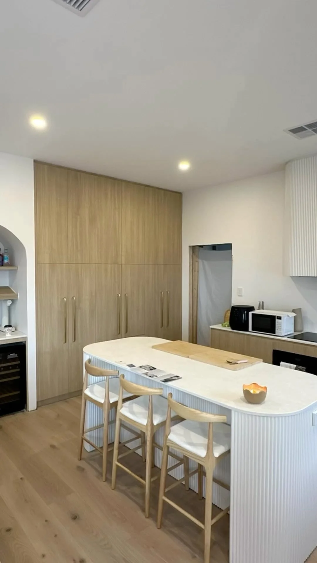 One of the standout elements of this project is the use of arches and LED lighting in the bar area and on the floating shelves. These features add depth and character to the joinery, enhancing the overall aesthetic and creating a sense of continuity throughout the home.